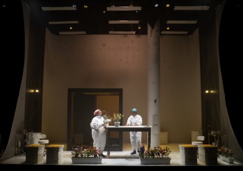 Walt Spangler’s single set for the science lab at the apiary with its two-story white netting and lab tables is realistic and believable. Unfortunately, it quickly grows tedious as it remains the same throughout the play. So too the costumes by Jennifer Moeller are generally white lab suits only differentiated by the women’s different colored head scarves. It is surprising that there are not more sound effects from the hives of bees in the design by Christopher Darbassie. Grace McClean’s original music accompanies Crousillat’s dances but fails to suggest the sound of bees.