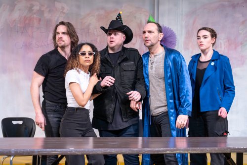 Stephen Michael Spencer, Shayvawn Webster, Jonathan Judge-Russo, Andrew Rothenberg and Mackenzie Moyer in a scene from Bedlam’s “The Assassination of Julius Caesar as Told by William Shakespeare and George Bernard Shaw” at the West End Theatre (Photo credit: Ashley Garrett)