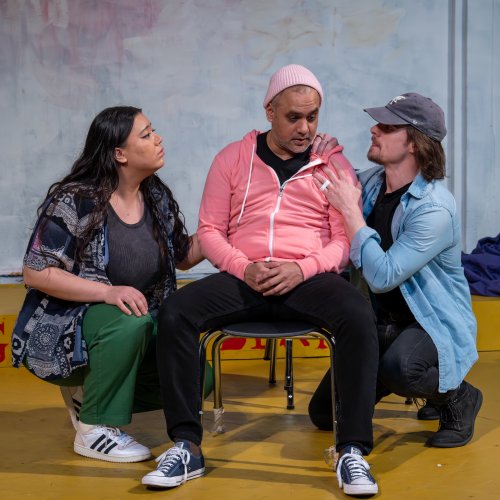 Deychen Volino-Gyetsa, Rajesh Bose and Stephen Michael Spencer in a scene from Bedlam’s “The Assassination of Julius Caesar as Told by William Shakespeare and George Bernard Shaw” at the West End Theatre (Photo credit: Ashley Garrett)