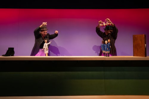 The scenic design by Cate McCrea and the costume design by Nicole Slaven are minimal and efficient yet effectively on target. Props/puppet designer Liz Oakley gets a special nod for her Parisian puppets, especially the soldiers who become doormen when their little caps drop down onto their heads from their strings.