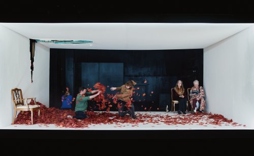 On arrival, the audience is greeted by the sight of scenic designer Walt Spangler’s arresting Stanley Kubrick’s 2001: A Space Odyssey-style white rectangular module floating in darkness. It’s sparsely furnished with vintage chairs, there’s a gaping hole that runs from a wall to the ceiling and a mound of red leaves on the floor. These get a symbolic workout as characters throw them around from time to time. This initial sight is accompanied by a mysterious whirring noise. Is the overbearing sound design the strategy of Nick T. Moore or due to faulty equipment? Mr. Moore’s contemporary recorded piano score is periodically broadcast at such high volume as to drown out the actors.