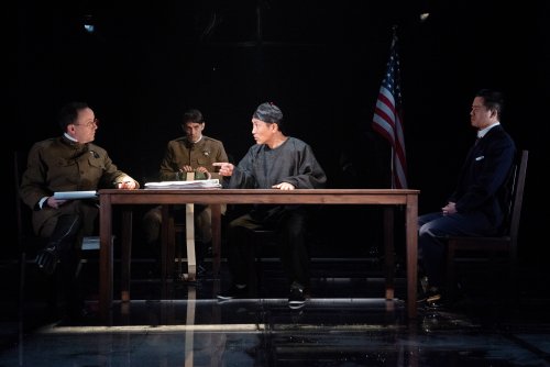 The play opens in an interrogation room, where it soon becomes clear that the outwardly obsequious Gee (Jinn S. Kim), a middle-aged Chinese man summoned to prove his American birth, is a much more complicated figure than suggested by his deferential statements in broken English to a grimly insensate immigration official (Christopher Liam Moore). Claiming that all of his documentation was destroyed in the horrific 1906 San Francisco earthquake, Gee not only expresses himself far better when speaking in his first language to a furtively advice-giving Chinese interpreter (Whit K. Lee), his demeanor also shifts to self-confidence bordering on arrogance when addressing this friendlier face. To be sure, Gee is still a victim of institutional racism, but there’s a strong hint he’s not a passive one.