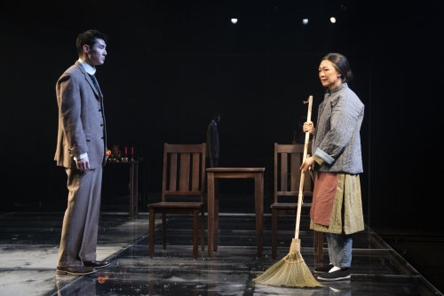 But to earn that exploitation, Gyet first must convince another immigration official (Ben Chase) that he is Gee’s son. This relentless browbeating eventually segues into a beautifully poetic and loving tribute to every Chinese person once confined on that strangely verdant speck of land in San Francisco Bay known unironically as Angel Island. That it would become for many of them a place of lost hope is reinforced by Jiyoun Chang’s sepulchral lighting and the sudden realization that Clint Ramos’s metaphoric set includes a surprising barrier between the audience and the characters. In effect, it’s an island, too.