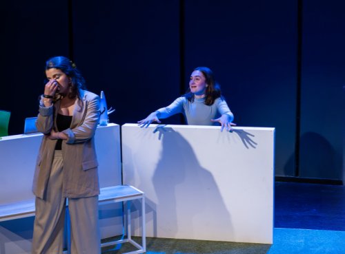 The production, under the deft direction of Mark Koenig, unfolds largely within AEI’s minimalist white-box lab, a sleek, sterile space brought to life by Josh Oberlander’s effective scenic design and Zack Lobel’s moody, emotionally attuned lighting. Hailey herself is never seen on stage; instead, she lingers just beyond the audience’s reach, bathed in cool light from the aisles—at once present and profoundly other, a choice that heightens her strangeness and underscores the central tension between flesh and code. The Glitch is further enhanced by Danny Colon’s appropriate-to-character costumes and atmospheric sound design from the playwright and his colleague Bryan Kohl.