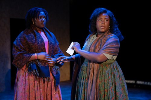 Clarissa Vickerie and Crystal Lucas-Perry in a scene from the Soho Rep production of Nia Akilah Robinson’s “The Great Privation (How to flip ten cents into a dollar)” at The Peter Jay Sharp Theater at Playwrights Horizons (Photo credit: Julieta Cervantes)