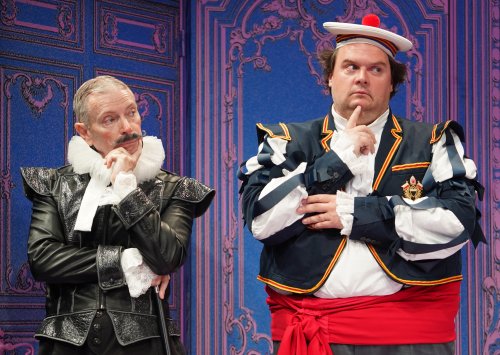 Arnie Burton as Dr. Diafoirus and Russell Daniels as his son Thomas in a scene from the Red Bull Theater production of Molière’s “The Imaginary Invalid” at New World Stages (Photo credit: Carol Rosegg)