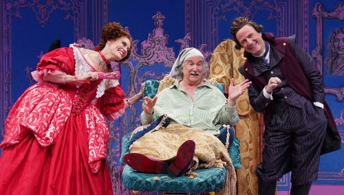 Not surprisingly, Argan sees four highly unqualified doctors in home visits in the course of the play. When Thomas arrives with his father Dr. Diafoirus to meet Angelique for the first time he proves to be the biggest oaf of all, needing his father to prompt him on every score. We also find out that Béline is having an affair with her lawyer De Bonnefoi who is writing up legal documents to cheat Angelique out of her eventual inheritance. It is Toinette who saves the day and straightens everything out including proving to Argan how deceived he has been about everyone in his life.