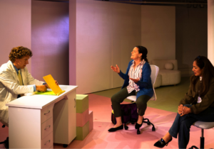 Technically, the production shines. Transitions between hospital rooms, imagined spaces, a wine bar, and even a meditation app are fluid and clear. Jeff Croiter’s lighting, working within an intentionally sterile white environment, carves distinct moods with subtle precision. Brandon Bull’s sound design deserves special mention, particularly in the “Clear Mind” app sequence—a sly, hilarious sonic collage that devolves from guided serenity into anxious reformations and guilty intrusive thoughts.