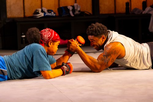 Andrew Boyce’s unit setting is a gym or arena taped off with the eight-sided shape used by the UFC (Ultimate Fighting Championship, the world’s premier professional mixed martial arts organization.) This is where the brother and sister usually meet except for the flashbacks to their childhood home. Cha See’s varied lighting often seen coming through the grimy gym or locker room windows adds to the atmosphere, both poetic and realistic. Mikaal Sulaiman’s original music and sound design heightens the tension as the play builds to its climax.