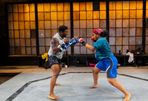 Written and directed by Ngozi Anyanwu, author of The Last of the Love Letters (Atlantic Theater Company) and Good Grief (Vineyard Theatre), The Monsters is a tour de force for two actors who have the chops for this very physical outing both emotionally and literally and luckily Aigner Mizzelle and Okieriete Onaodowan have what it takes. Aided by the choreography of Rickey Tripp, the fight direction of Gerry Rodriguez, and the work of MMA consultant Sijara Eubanks, the realistic fights mainly pantomimed with only one participant (except for Lil’s training sessions which include Big) make us believe we are seeing two people fighting.