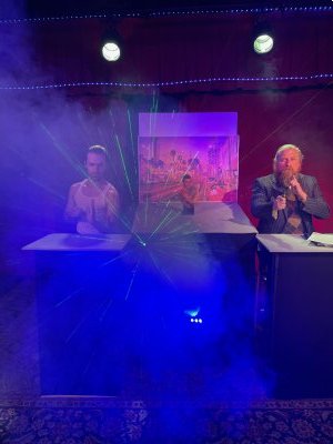 The other director is Paul Smithyman who also designed the efficient conglomeration of a set which includes two podiums for the actors and a screen for the snippets of films and slides used to illustrate the story. In front of the screen is a slotted board into which the actors insert funny two-dimensional stick puppets.