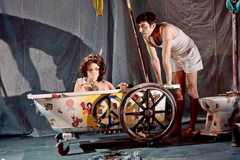 Before The Sickness begins, the audience gets its opportunity to review scenic/costume designer Vincent Gunn’s economical and perfect set: walls of filthy plastic sheeting, a grungy bathtub and seatless toilet, both on wheels and sporting sparse graffiti, a nondescript piece of art on an easel, and errant pieces of clothing strewn across the stage.
