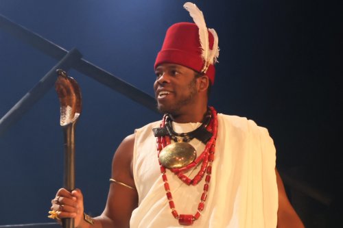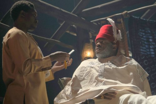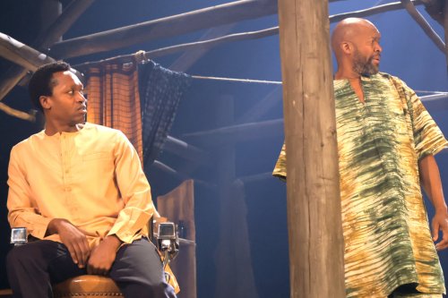 All is far from well in the city—or with the prodigal son, Awuchike, the first to leave of the twin brothers, who has not only severed all ties with his parents since leaving home but has also betrayed his own blood in ways that cut deep. His absence hangs over the family like a storm cloud, but it’s the younger twin, Igwezu (Blankson-Wood), who returns, hollowed out by the betrayal and ruin. Beneath his quiet, dutiful exterior, a slow-burning rage simmers, and in his confrontation with the Kadiye—the village priest clad in fine robes and false promises—it finally erupts. Chiké Okonkwo’s well-fed Kadiye is all polished charm and ritualistic pageantry, offering blessings and prosperity in exchange for offerings, but to Igwezu, his patter sounds as hollow as the empty baskets left behind by floodwaters. It’s a devastating moment of reckoning—not just between man and god, but between illusion and truth, tradition and survival.