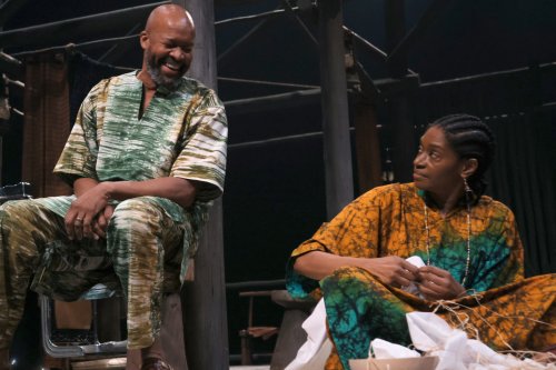 Timpo orchestrates the cast with the precision of chamber music. Leon Addison Brown’s Makuri, a quiet-spoken barber and basket-weaver, hums with warmth and quiet resignation, his optimism tempered by a sadness he dares not name, and the powerful Jenny Jules, a tower of maternal strength, gives the character of Alu, Makuri’s devoted wife, a resonance that lingers even after she exits halfway through—a curious absence in a play that otherwise leans on the power of presence. She crafts vibrant traditional Yoruba cloth, remaining tethered to their ancestral land, her colors juxtaposed to that graying earth, drowning beneath seasons of relentless rain. Around them, farms sink into swamp, and the future seeps away with the rising water.