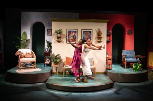 Teresa Williams’ colorful set is used to represent first the hospital and then various rooms in Emi’s house. The attractive design has three platforms, backed by a red archway on stage left and a white and blue one on stage right, and on center stage a beige wall with brightly colored paintings for Emi’s living room. One of the side walls is in blue with multicolored corrugated panels with posters in English representing Florida while the opposite side wall is in red with posters in French representing Haiti which comes into use at the end of the play. Dina El-Aziz’s costumes are also colorful, Emi’s in particular often in shades of red or brightly colored patterns. Bean’s wardrobe is more subdued, the colors of a high-powered professional. The lighting by Gulbranson beautifully depicts various times on the clock including bright sunny days and blue moonlit nights. KaileyKielle Hoga and DJ Potts’ sound design includes appropriate songs sung by female singers between the scenes.