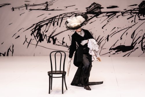 The visual field alone announces a radical departure. Complemented by Krista Smith’s astute lighting, Emona Stoykova’s production design is rendered as a vast, unbroken plane of white, stretching back until it meets a looming wall upon which is scrawled, in bold, black, impressionistic strokes, the ghost of a countryside—structures, fences, roads—less a place than a memory of place. It is both austere and exuberant, a blankness charged with potential. Into this void trundles, with an almost Beckettian deadpan, a faceless contraption of scrap wood: a small, makeshift robot bearing a placard that reads, with disarming literalism, “Empty stage.” It exits, returns, revises the terms—“Summer,” “Countryside”—as though the production were constructing its own ontology before our eyes. The audience laughs, but the laughter is edged with recognition; we are being instructed, gently but firmly, in how to see.