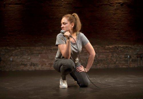 Jacqueline Novak in a scene from her show “Get on Your Knees” at the Cherry Lane Theatre (Photo credit: Monique Carboni)