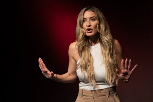 Nicole Travolta in her one-woman show “Nicole Travolta Is Doing Alright” at the SoHo Playhouse (Photo credit: Joan Marcus)