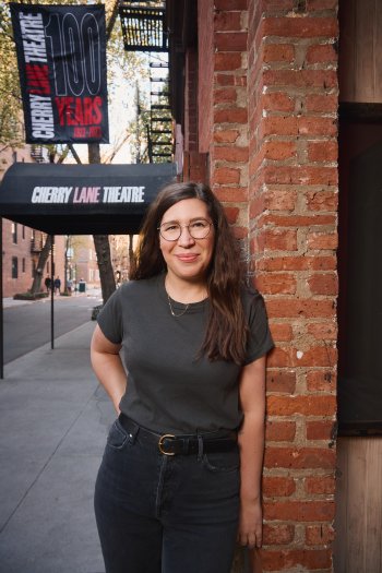 Alison Leiby outside of the Cherry Lane Theatre where her “Oh God, A Show About Abortion” is now playing through June 5 (Photo credit: Mindy Tucker)