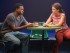 The minimal scenic design is of basic furniture that includes bar stools, benches, chairs and a small stuffed dog.
