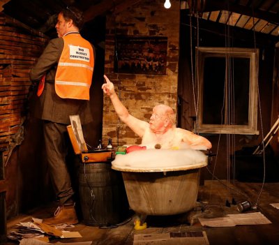 The play begins with the sight of a small crooked ramshackle farmhouse that pivots to reveal Pugh in his dilapidated bathroom. Scenic designer Charlie Corcoran’s work is highly accomplished and superbly realizes the physical dynamics of the play eliciting laughter from just looking at it.