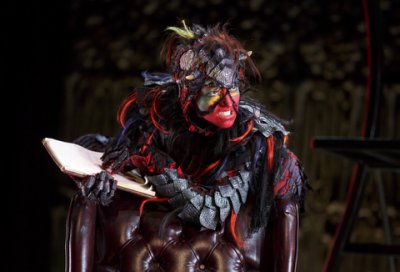 This Grand Guignol concept is sensationally realized by the striking physical production. John Gromada’s chilling sound design configures his spooky original score with its dominant organ along with bomb blasts and other sound effects for very effective results. Cameron Anderson’s scenic design is a dazzling haunted house affair with the stage wall covered in tiny bones and skulls, a ladder and ramp for the creature to scamper on, and manor-style furnishings. Hellish red hues are prominent features of Jesse Klug’s eerie lighting design.