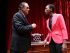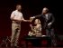 The immense task of delivering that character’s voluminous amount of verbiage here falls to Brent Harris. Mr. Harris appeared as the villainous Scar in the national tour of The Lion King and played a number of classical roles at numerous major regional theaters across the United States. His wide range of experience and performing talents are quite evident. Tall, athletic, physically fluid, possessing a rich and throaty voice and with boundless energy, he commands the stage.