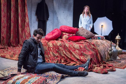 The much darker second act takes place two weeks later at a photography studio where Leila is to be shot for the cover of her book. The setting, chosen by her publisher to attract the American audience, is an Orientalist fantasy of a bedroom, complete with arabesque patterns, Middle Eastern carpets, and cushions strewn all over the space, a cliché of the visually exotic, sensual and seductive. To make it worse, it is assumed by her editor that Leila will wear the Arab abaya and niqab from which only her eyes will show, like traditional Muslim women. All three characters meet again, only this time Rashid is very drunk as he can’t deal with the situation and Doug is still fuming from his treatment in their home two weeks previously.