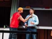 James Caverly and Andew Morrill’s Trash is a provocative play about two late 20s deaf roommates who have nothing in common except sharing an apartment. However, what is most intriguing about Trash is that it told in multiple ways. As the main characters are both deaf, they use American Sign Language to communicate. As a concession to hearing audiences, some of the dialogue is projected on three walls facing the audience. Still more unusual, there is a jukebox on stage (played by Chris Ogren) which, when fed with dollar bills, translates the ASL into spoken speech. When the lead characters really want us to know what is being said they use this method. However, this is only used partially. Much of the play is told only in ASL but Caverly and Morrill are so adept (and so dramatic) at it that we often feel like we know exactly what they are saying. They also use white boards which they hold up for all to see for simple statements or questions to the audience which sometimes require answers.
