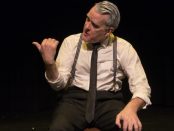 Exhibiting the dazzling wizardry of someone who trained at the École Jacques Lecoq in Paris, Murfi is breathtaking as he clowns, mimes and barrels all over the space while distinctively rendering each character. His synthetic gray hair, malleable facial features, striking eyes that are in constant motion and affable presence enable him to swiftly shift from one denizen to another and he also channels several simultaneously. He plays Kitsy, Pat, a busybody who runs the newspaper store, a family friend, priests, and an assortment of colorful locals. [more]