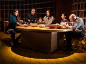 Inspired by the playwright’s attending a silent spiritual retreat at an upstate New York institute in the woods, this is an absorbing play which immediately causes the viewers to listen intently as our world is never really silent. In Stowe Nelson’s remarkable soundscape, the play begins with a torrential rain, and then proceeds to a great many sounds we usually take for granted (both performed by the actors and recorded): breathing, laughing, clicking of a pen, sighing, a gong ringing, whispers, giggling, crickets chirping, the crunching of chips, birds, a sip of tea, a sneeze, coughing, a cell phone ringing. As a result of this state of affairs and the fact that the actors (in general) don’t speak, we become attuned to watch the smallest facial expression and other forms of non-verbal communication. [more]