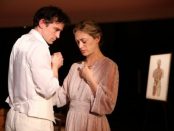 When Tennessee Williams started writing "Summer and Smoke," his working title for the play was "Chart of Anatomy," taken from a poem by Hart Crane. An anatomical chart becomes one of the very few props in the current Classic Stage Company and Transport Group revival of the 1948 play. Under the circumstances, the many players (a dozen in all) are often reduced to charades, as they describe a new gaudy hat, or a jigsaw puzzle, or gloves. For that matter there’s not really a set at all, only a large white platform in the center of the playing area, echoed by a large white rectangle hanging above--a kind of ceiling for the platform--and shortly after the prologue, six chairs, two of which will, at times, serve as a bench or a sofa. [more]