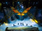 The show includes pole vaulting, giant flowers that rise up out of the ground, the building of the bone structure of the totemic Thanator, the high flying of the Toruk, a flock of birds played by kites, pulsating live drumming, two earthquakes, the lava flow, a three story water fall, and the rise of the river by which the Pandorans are saved. Along the way the questers are beset by various exotic animals played by 16 huge puppets (designed by Patrick Martel) which are manipulated from inside by the performers. As the trio travel from one clan to another, the environment before us morphs from one colorful place to another in Carl Fillion’s monumental set and prop design. [more]